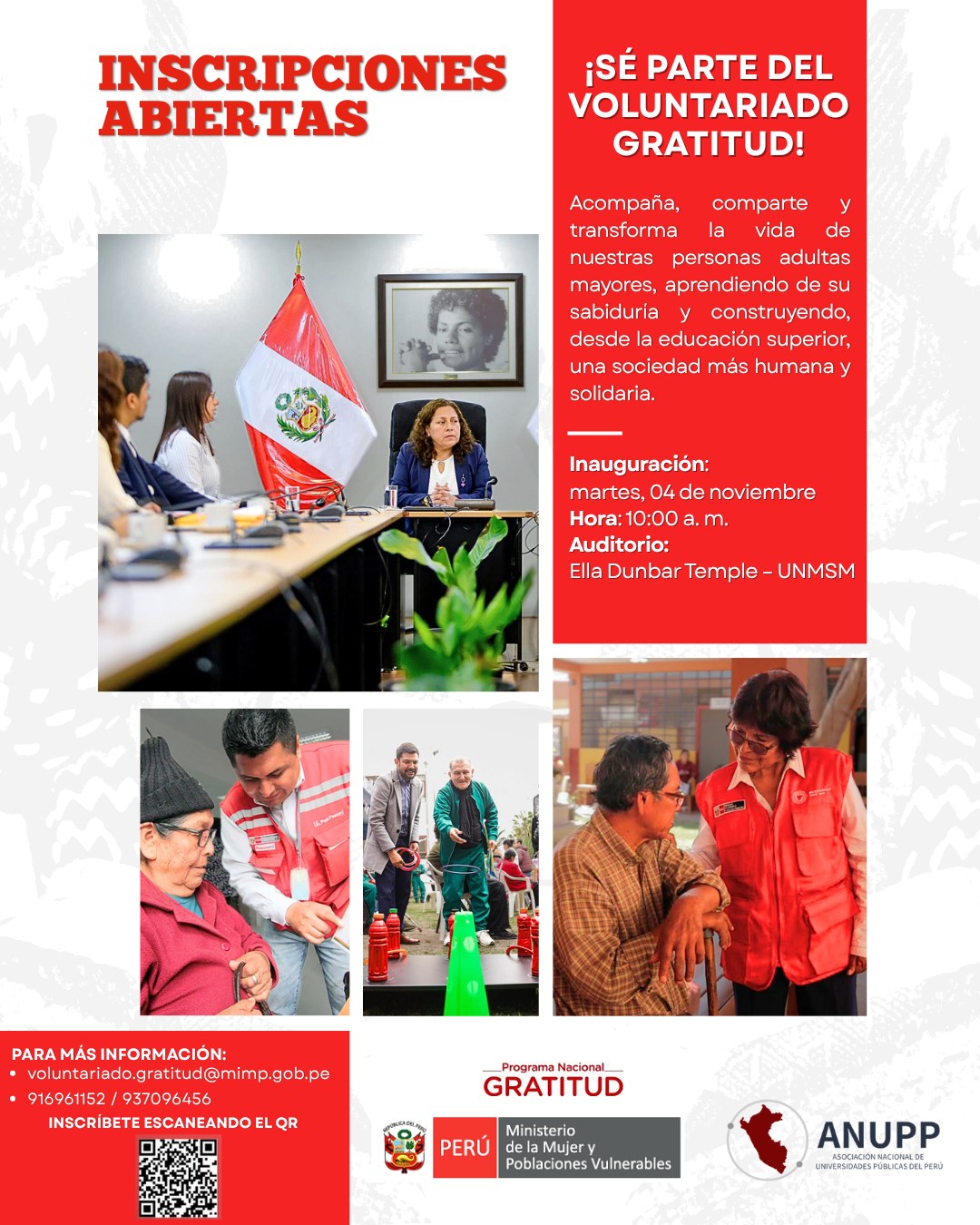 ¡Inscríbete y se parte del Voluntariado Gratitud! El Programa Nacional GRATITUD del Ministerio de la Mujer y Poblaciones Vulnerables del Perú, con el apoyo de la ANUPP, invita a estudiantes, profesionales, funcionarios y ciudadanía en general a unirse al Voluntariado Gratitud, una valiosa iniciativa que busca acompañar, compartir y transformar la vida de las personas adultas mayores, promoviendo la empatía, el respeto y la solidaridad intergeneracional. Inscripciones abiertas hasta el 31 de octubre: Inaguración: Martes, 04 de Noviembre Informes: Teléfonos: 916961152 / 937096456 ¡Súmate al cambio y contribuye con quienes nos abrieron el camino! |