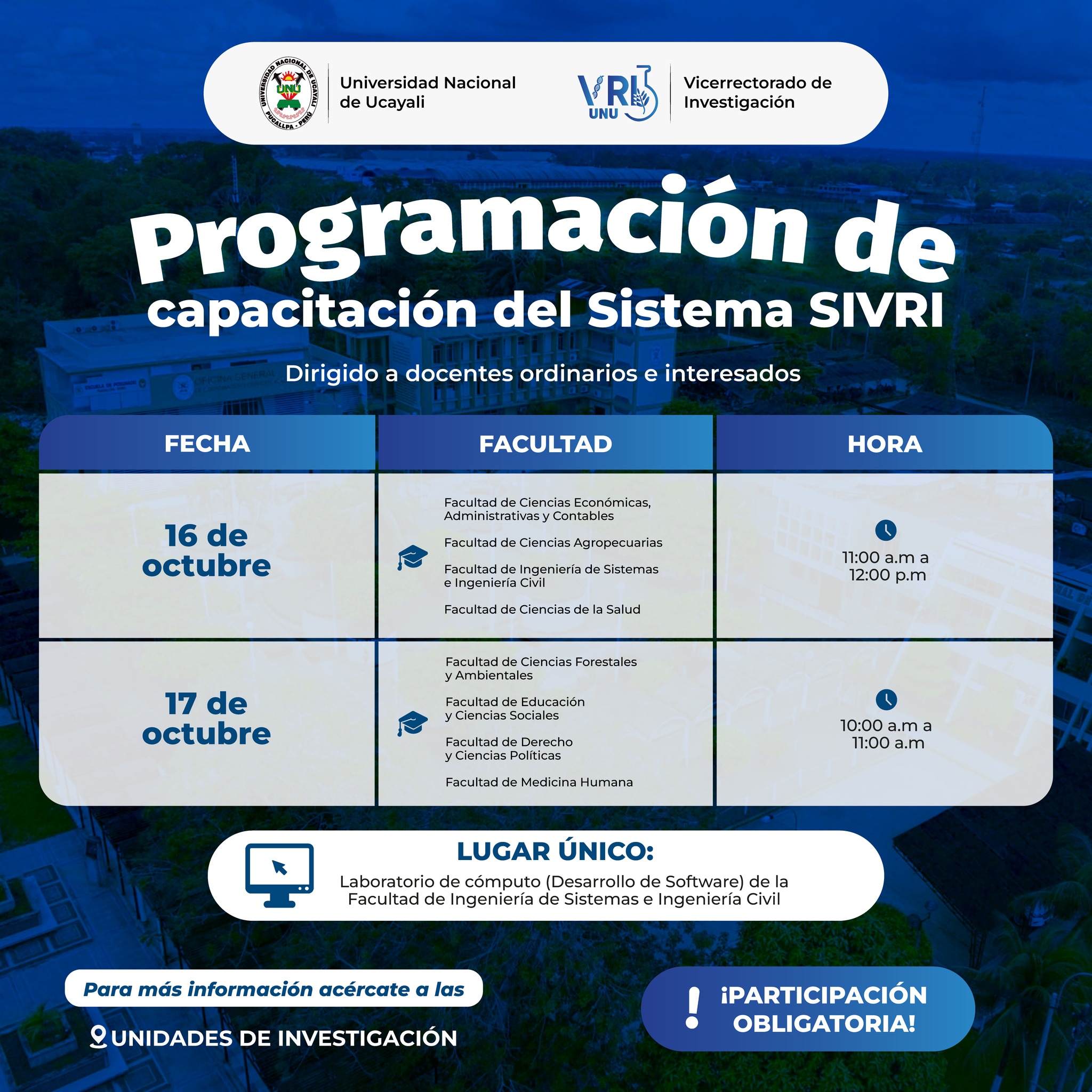 De acuerdo con el cronograma, las capacitaciones iniciarán los días 16 y 17 de octubre con docentes e investigadores de las diversas facultades. Las sesiones se desarrollarán de manera presencial en el laboratorio de cómputo (Desarrollo de Software) de la Facultad de Ingeniería de Sistemas e Ingeniería Civil.